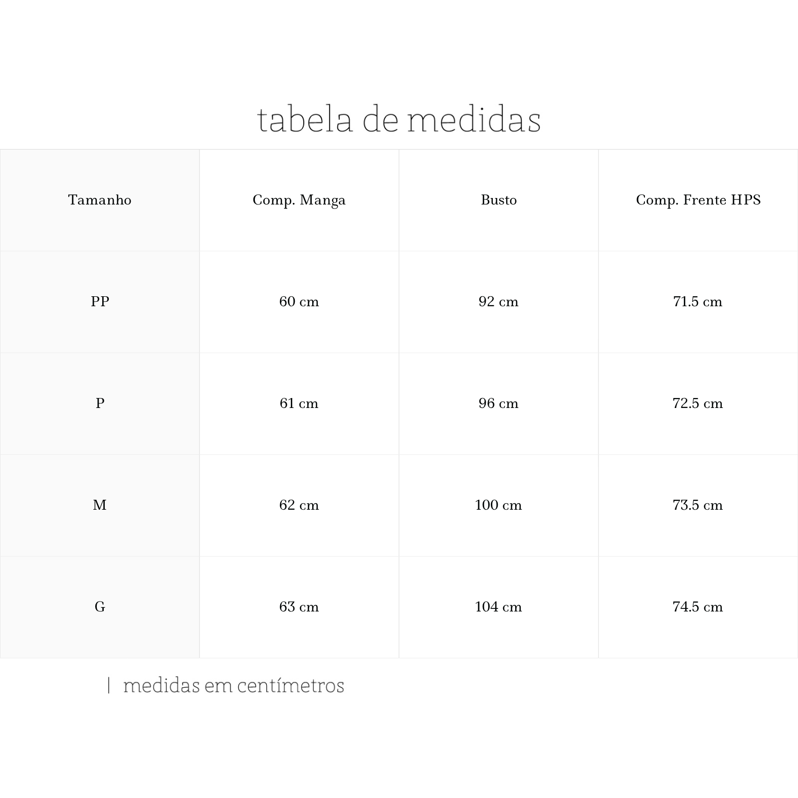 A modelo mede 1,77m, tem busto 82cm, cintura 60cm e quadril 89cm. Veste tamanho 34/PP.