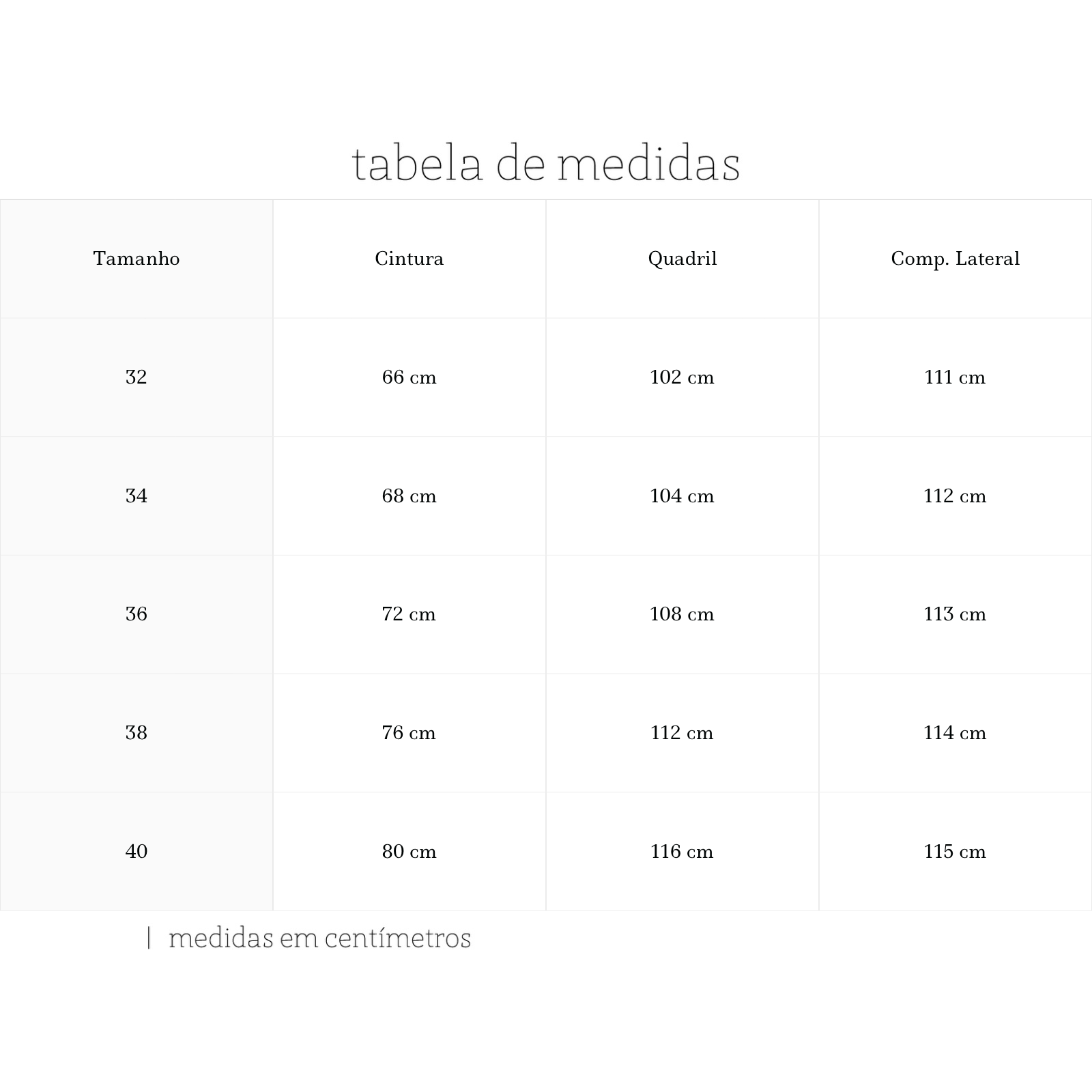 A modelo mede 1,75m, tem busto 78cm, cintura 61cm e quadril 87cm. Veste tamanho 34/PP